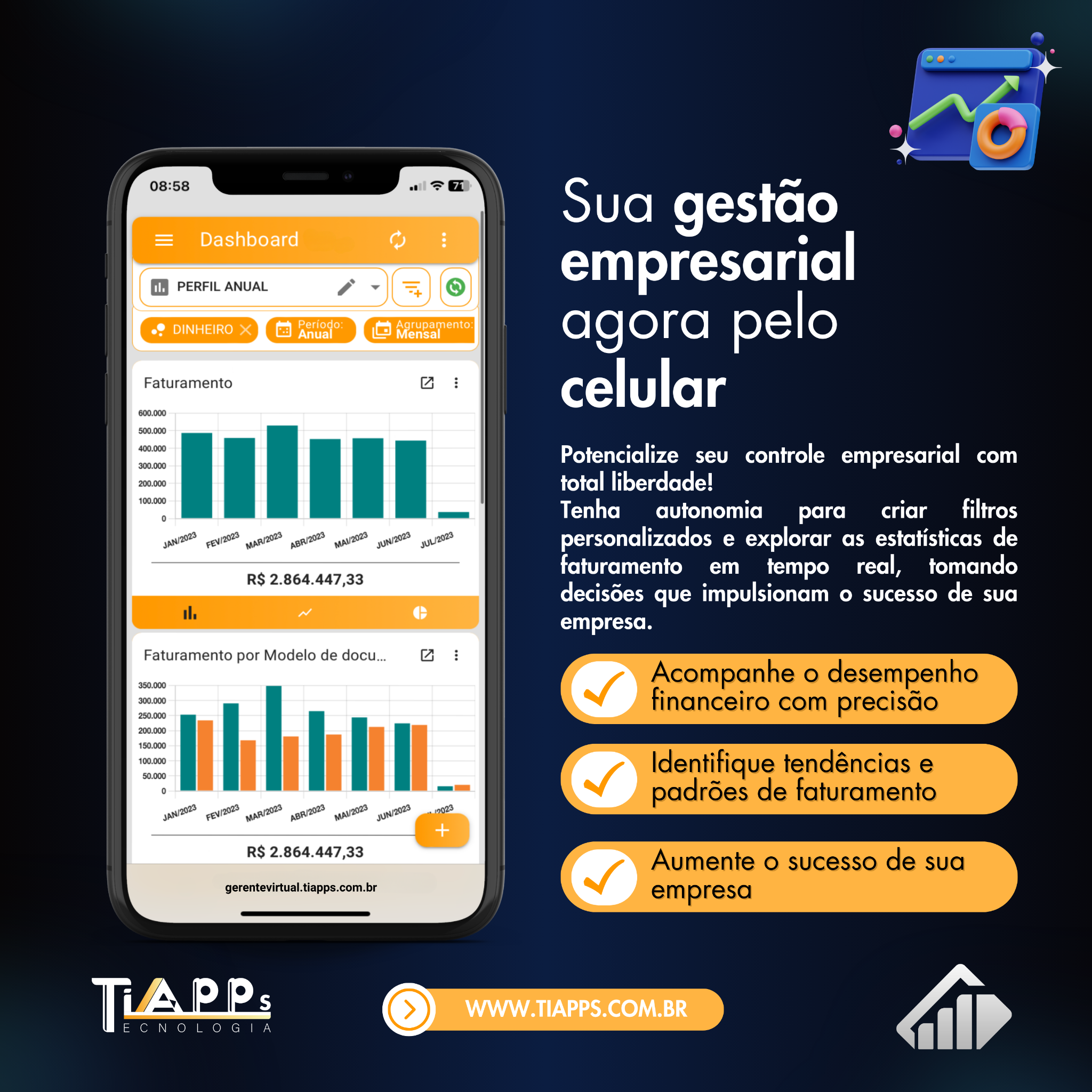 Com a nova plataforma de gestão empresarial da TIAPPs, você pode controlar todos os aspectos do seu negócio diretamente pelo celular. Tenha acesso a relatórios detalhados, gráficos financeiros em tempo real e crie filtros personalizados para otimizar suas análises. Essa ferramenta permite que você tome decisões mais rápidas e embasadas, aumentando a eficiência da sua gestão e maximizando os resultados da sua empresa.